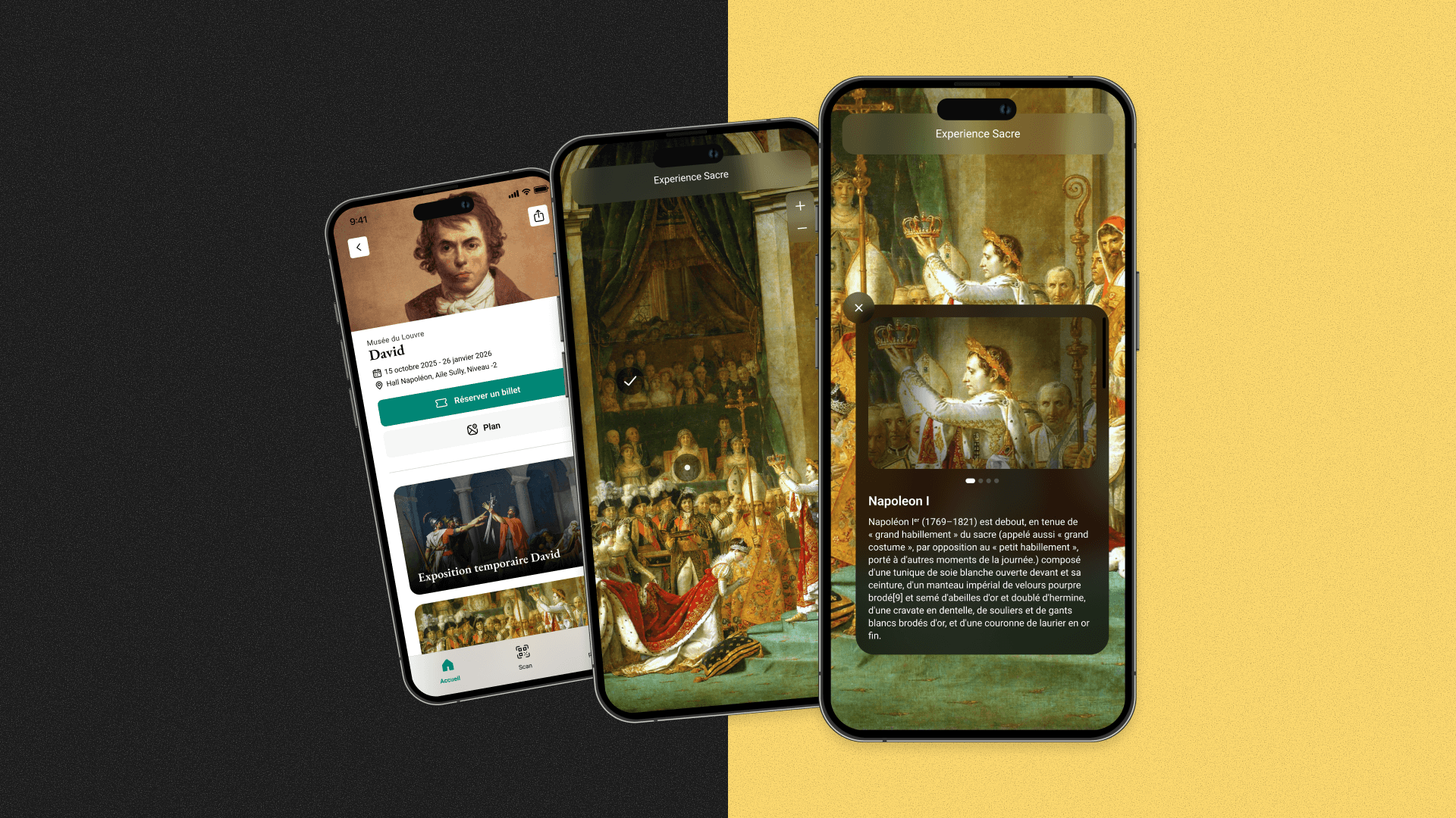Using our advanced object recognition technology, visitors are able to scan the painting and discover interactive hotspots and insights. Want to find Napoleon’s mother in the crowded scene? Curious about the significance of the occasion? Wondering what all the coronation regalia is for? Our technology guides you through these details and more at your own pace. Information is available in both French and English.