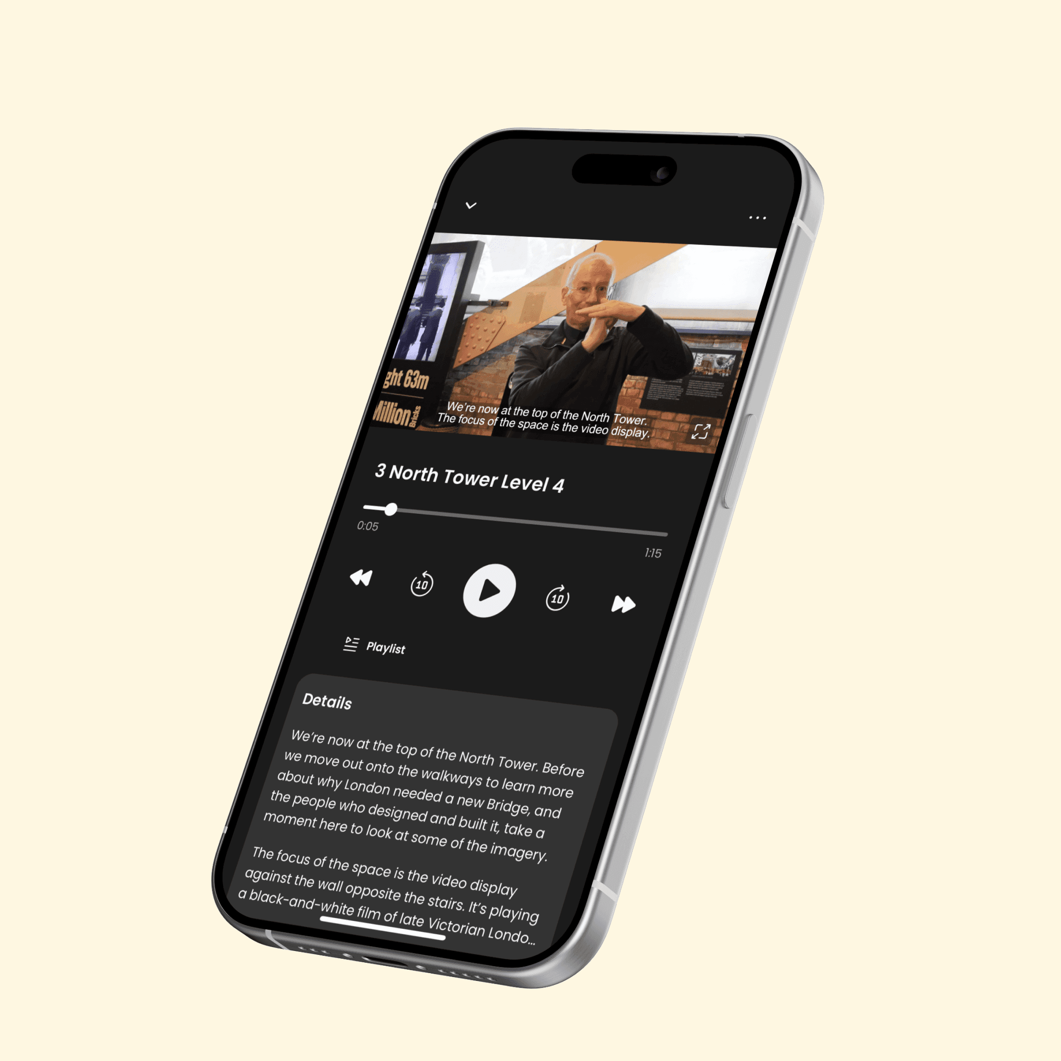 Give your stories the premium treatment with our purpose-built media player. It includes full transcripts, offline downloads, adjustable playback speed, in-tour wayfinding, multiple languages, and layered content. Smartify makes it easy to deliver rich storytelling that adapts to each visitor’s pace and needs.